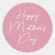 Essas etiquetas adesivas apresentam um tema elegante de Dia de as mães em um lindo fundo rosa. A saudação, "Dia de as mães Feliz" é impressa em uma fonte de script branco no centro. O confete cor-de-rosa acentua as partes superior e inferior dos autocolantes.