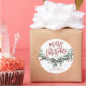 Um adesivo festivo, vermelho, verde e branco de presente de Natal, adesivo de favor ou invólucro de envelopes com guião em negrito e verde-aquarela com folhas e bagas.