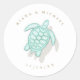 Uma textura aquosa nos tons macios do mar e da areia é o fundo de elementos marinhos, como estrelas-do-mar e conchas, que são melhorados com ondas de espuma marinha para criar as peças desta suíte de casamento. O adesivo do favor de casamento mostrado aqui mostra uma tartaruga central e uma ilustração de sombra circulada pelos seus nomes e data do casamento. Procure ID837 para ver todas as peças de coordenação neste conjunto.