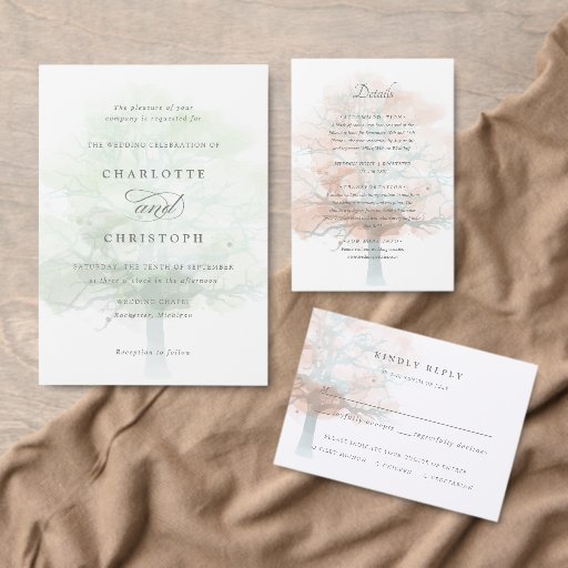 Envelope leve e arejado sela elogiando a coleção de casamento "Misty tree". Apresentando um carvalho aquoso, simbolizando um amor duradouro. Água sutil e serena em tons rochosos de cor rosa e cobre, inspirada pela estação do outono. Personalize o rótulo com os nomes da noiva e do noivo