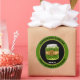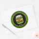 Picles caseiros personalizados com adesivos redondos. Apresentando uma borda verde picante, texto preto, uma imagem de um pote de picles, e uma modelo para adicionar quem os picava e a data.