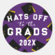 Selos de envelope de formatura criativos, etiquetas de lembrancinhas de festa ou adesivos de presente de graduado com características de gorros de formatura pretos e dourados em fundo roxo.