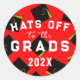 Selos de envelope de formatura criativos, etiquetas de favores de festa ou adesivos de presente de graduação com tampas de graduação pretas e douradas em fundo vermelho da escola.