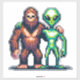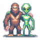 Arte Pixel 8-bit pé grande sasquatch e ser alienígena extraterrestre amigos em uma resolução de vibração de jogo.