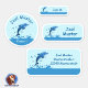 Niedliche wasserfeste Schulaufkleber für Kinder, mit einem Delfin der aus dem Wasser springt. Set mit 24 verschiedenen eckigen und runden Namensaufklebern.