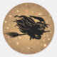 Silhueta negra de uma bruxa voando pela noite em sua vassoura. Alguns designs têm mais de uma bruxa voando como se estivessem em formação. Alguns têm um fundo de orangia-ouro com estrelas.