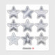 Coletor com nove estrelas prateadas com várias texturas superficiais. Note que este é um produto impresso e não é brilhante. Estes adesivos recortados são perfeitos para a raspagem, o jornalismo, presentes e decoração. Também disponível em ouro.