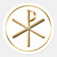 Símbolo Chi-Rho de ouro brilhante sobre fundo branco. O Chi-Rho é um símbolo cristão antigo derivado das duas primeiras letras do "Cristo" em grego.