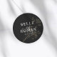 An elegant round wedding sticker featuring a sophisticated black background with soft botanical greenery. The design highlights the couple’s names and wedding date in timeless typography, creating a modern and romantic finishing touch. Perfect for sealing envelopes, decorating wedding favors, invitation suites, or adding a stylish detail to your wedding stationery.