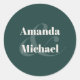 Projete um senso de simplicidade moderna com esta simples noiva na moda e design de etiqueta de noivo na popular escolha de cores - eserald green com texto leve. Os nomes da noiva e do noivo são apresentados em tons de negrito com um grande na moda e juntando-se aos seus nomes. Estes autocolantes estão disponíveis em tamanho pequeno de 1/2 polegada de diâmetro e tamanho maior de 3 polegadas de diâmetro. Os menores fazem selos de envelope legais ou para uso em pequenos itens de presentes. Os maiores são excelentes para adesivos de favor, e uso em sacos de presentes e itens maiores.