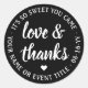 Adicione um toque personalizado aos favoritos para festas e agradeça suas notas com adesivos circulares personalizados "amor e obrigados" / selos de envelopes. Toda a redação nesta modelo é simples de personalizar para qualquer ocasião, como casamento, chá de panela, graduação, festa de aniversário, aniversário ou aposentadoria. A design a preto e branco apresenta a caligrafia moderna dos scripts no nome e data do evento de tipografia central e na moda em círculo. Como opção, altere o texto curvo para um nome e endereço para fazer etiquetas de endereço de retorno redondo. Essas etiquetas elegantes adicionam um toque exclusivo e personalizado a uma celebração de dia especial.