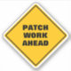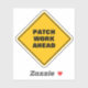 Sinais engraçados e clássicos de caução de diamante amarelo advertem sobre o trabalho de patch em frente em uma espessa fonte preta de sans serif. Um presente bem pensado para uma costureira, colcha de retalhos, um artista de reparação de asfalto na sua vida.