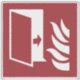 Porta de proteção contra incêndios e ícone de chama em fundo vermelho.