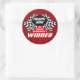 Vinheta de bandeiras de corrida pretas e brancas com fundo vermelho. Obrigado pelo adesivo por sua festa de aniversário de corridas.