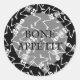 Skeletons sobre fundo negro e BONE APPÉTIT em letras quentes, esses adesivos redondos são divertidos para sua festa de Halloween. CORRESPONDENDO a itens na nossa loja.