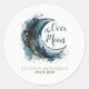 Convide os convidados a comemorar a sua chegada com esta charmosa etiqueta de chá de fraldas "Sobre a Lua", que contém estrelas douradas e um fundo azul macio.