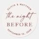 A minimalist wedding sticker designed for “the night before” celebration, most commonly used for rehearsal dinners and pre-wedding gatherings. Set on a soft ivory background with deep burgundy typography, the design combines a script detail with clean lettering for a balanced and modern look. The circular format makes it easy to use across your wedding setup: from sealing envelopes to decorating welcome bags and small event details. Simple and intentional in style, this sticker adds a small but thoughtful detail to your pre-wedding event.