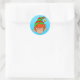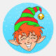 Uma ilustração original de um elfo alegre de Natal com cabelo vermelho e um chapéu festivo vermelho e verde sobre um fundo azul inverno.