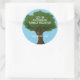Personalize seu adesivo de lembrança azul de reunião da família com o nome da sua família e o ano de reunião em texto branco. Uma árvore está no fundo. No fundo, você pode adicionar onde sua reunião está ocorrendo.