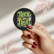 Get ready for a spooky good time with this "Trick or Treat" Halloween sticker! Featuring slimy green lettering in a creepy graveyard scene complete with jack-o'-lanterns, ghosts, and bats, this design is perfect for the spooky season. It's an awesome choice for decorating laptops, water bottles, and notebooks, or for sealing Halloween party favor bags.