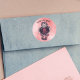 This spooky Valentine sticker has a rag doll with stitched mouth and faux yarn hair holding a big black heart with red bow and trimmed in white lace on a mix of pink and red. Customise your text with the template.
