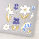 Flores brancas, azuis e douradas ilustradas como queda de neve, anêmona de madeira, bluebell e violeta de cachorro. Este conjunto de adesivos pode ser usado para revistas de arte e lixo, planejadores e diários. O brilho dourado usado nesse impressão é simulado, não é uma relíquia real. Arte original de Marketa Stengl.