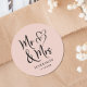 Um adesivo cor-de-rosa pincelado para sua correspondência de casamento e favoritos para festas com "Sr. & Sra." escrito em um grande roteiro e uma ilustração de dois corações se juntaram. Adicione seu nome e data do casamento.
