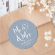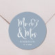 Um adesivo azul empoeirado para sua correspondência de casamento e favoritos para festas com "Sr. & Sra." em um roteiro branco elegante e uma ilustração branca de dois corações unidos. Adicione seu nome e data do casamento.