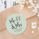 Um adesivo verde de sábio para sua correspondência de casamento e favoritos para festas com "Sr. & Sra." em um roteiro elegante e uma ilustração de dois corações unidos. Adicione seu nome e data do casamento.