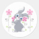 Este adesivo redondo é mostrado em branco com um belo coelho e impressão de flores cor-de-rosa. Personalize este item ou comprar como está.