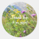 País, estilo rústico, o autocolante do tema natureza. Dia ensolarado brilhante no campo. Flores silvestres coloridas (cor amarela, botão solteiro roxo) e ervas no campo, montanhas azuis ao fundo. Pode eliminar o texto "Obrigado pelo seu apoio" ou substituí-lo pela sua própria mensagem (clique em "Personalizar esta modelo"). Para mais modificações (estilo de fonte, cor de fonte, posição de texto), clique em "Editar design".