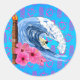 Surfando arte de surfista montando uma grande onda com uma estátua tiki flamejante e flores de hibisco. Com fundo azul oceânico e tartarugas do Mar de Honu Havaiano cor-de-rosa e Máscaras de Tiki.
