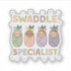 A cheerful pastel illustration featuring four peacefully swaddled babies with soft fabric textures, stitched lettering, and gentle heart accents. The playful “Swaddle Specialist” typography frames the babies, creating a warm, caring, and professional feel. Loved by NICU moms, preemie parents, and baby care specialists, this design celebrates nurturing, expertise, and tiny beginnings with sweetness, diversity, and charm.