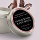 Etiquetas redondas para embalagens de produtos modernos, em preto elegante e ouro rosa - perfeito para usar como adesivo de tampa para frascos de vela, latas ou bolsas. Apresentando borda de efeito de folha de ouro rosa-rosa rosa e fundo preto com o tipo de serifa e espaço modernos para o seu nome de marca. Adicione seus nomes de cheiro e faça adesivos luxuosos para seus produtos. Edite no editor de design e revele algumas opções de texto de guião de bronze em ouro, incluindo 'vela perfumada', 'vela de cera de soja', 'vela de luxo' e 'feita à mão' que você pode escolher.