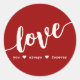 Tendy elegante adesivo redondo com uma escrita proeminente "LOVE" num fundo de cor rica. Perfeito para Dia de os namorados, dia mais doce, casamento, aniversário ou qualquer dia!