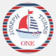 Primeiro aniversario náutico náutico do menino bonito personalizou adesivos com barco a vela, em um quadro branco e marinho e fundo listrado vermelho. Personalize o texto você mesmo quando solicitar