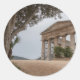 Um autocolante fotográfico redondo com as ruínas do antigo templo grego em Segesta, Sicília, Itália, visto sob uma oliveira antiga num dia nublado.