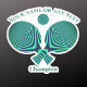 Design de estilo retrô de duas raquetes de tênis de mesa e uma bola de pingue-pongue em verde-turquesa com um padrão hipnótico em fundo amarelo para amantes de pingue-pongue e jogadores de tabletes.