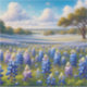 A dreamy expanse of Texas bluebonnets stretches across rolling hills, bathed in soft sunlight beneath a bright, cloud-dappled sky. The palette glows with vivid indigo, lavender, and creamy white blooms, set against golden-green grasses and scattered oak trees that frame the distance with grace. This enchanting landscape evokes a serene, pastoral mood—perfectly capturing the quiet magic of springtime in the countryside. Painted in a romantic, slightly impressionist style, the composition offers both depth and warmth, with gentle gradients of light and color that draw the viewer in. Ideal for those who adore wildflower fields, Southern charm, and nature’s soft grandeur. AI generated artwork.