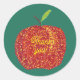 Pretty painting of a red apple with yellow highlights, in pointillism, with Thank you written in yellow letters across the apple, is printed on a background of green, on stickers. The text can be customized on the template form. The background color of green can also be customized. Thank you for shopping at CherylsArt on Zazzle.
