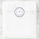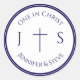 Design features the initials of bride and groom displayed in a navy-blue print. The image of a cross is featured between initials. The customizable phrase, "One in Christ" is displayed above as an arch. Names of bride and groom are featured at bottom. Design is framed by an elegant navy and white border. Designed to coordinate with the Timeless Catholic Monogrammed Wedding Suite.