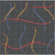 Estilo retrô dos anos 80 com pinceladas de tinta de cores primárias em salpico sobre um fundo geométrico pontilhado de preto e branco.