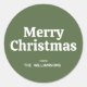 Adesivos de Natal simples modernos com a inscrição "Natal Feliz" exibidos em tipografia retrô branca com fundo verde pinho. Personalize os adesivos de Natal verdes com o nome da sua família ou texto personalizado. Os adesivos de feriado elegantes são perfeitos para usar em selos de envelope, distintivos de Natal, embrulho de presentes, lembrancinhas de festa..