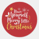 Tenha um Natal Feliz em uma letra decorativa de escrita cursiva em branco e ouro amarelo. Embelado com uma estrela, flocos de neve, holly e um galho de agulhas verdes. Colocado num vermelho quente muito saturado.