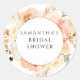 Rótulos adesivos redondos personalizados, ou topo de cupcake DIY mostrando uma linda coroa floral em aquarela em uma bela mistura de tons de creme de pêssego, rosa e champanhe. Capacidade de personalizar todas as seções de texto. Duas opções de tamanho e várias opções de forma para escolher. Se usado como um topo de cupcake, basta colar um palito entre dois adesivos. Coleção com produtos coordenados disponível!