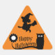 Foto de uma bruxa na vassoura e uma coruja em um galho com desejos de "Feliz Dia das Bruxas" são apresentadas neste adesivo do triângulo. Excelente de enviar aquele cartão especial de Halloween, um livro de rascunho, decoração, truque ou trapaça!
