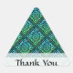 Um conjunto de adesivos triangulares de "Obrigado" com um desenho de nó celta azul-esverdeado repetido em forma de diamante sobre um fundo preto. Ou, personalize "Obrigado" com sua própria mensagem! Também disponível em outras formas!