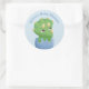 Um adesivo decorativo com um pequeno tricerátopo verde, recém-nascido de um ovo. Personalizar com mensagem no modelo de texto fornecido. A cor de fundo pode ser alterada.