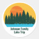 Um belo adesivo de férias de lago familiar com as bonito águas azuis sob a floresta de árvores e o pôr do sol de laranja legal. Uma viagem de acampamento bonito mantém o souvenir para o seu grupo de excursões naturais ou selvagens.