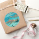 Um adesivo fotográfico redondo com tubarões-recife com ponta preta e peixes-borboletas durante o mergulho na clara lagoa azul da ilha pacífica de Bora Bora, perto do Taiti, na Polinésia Francesa.